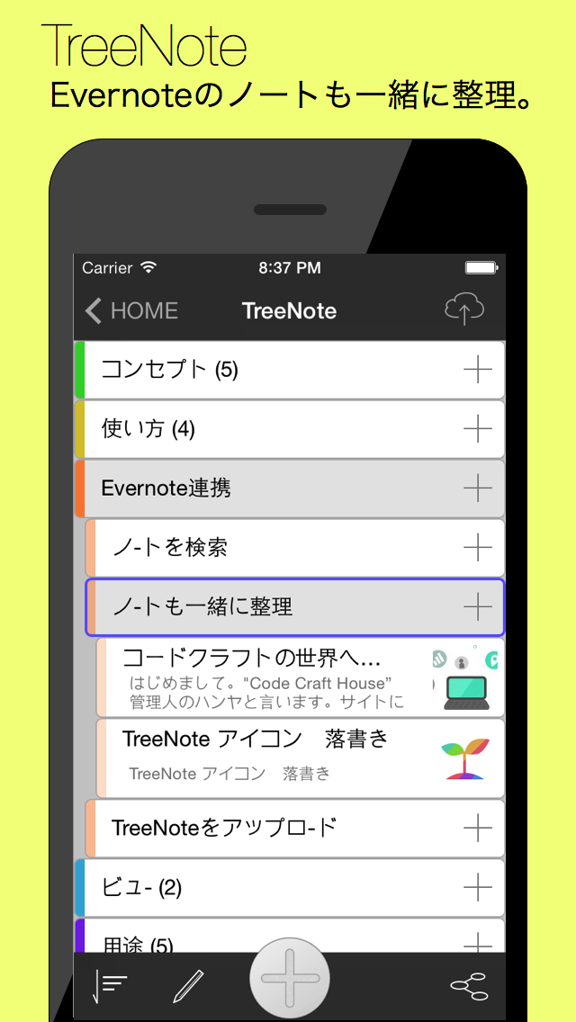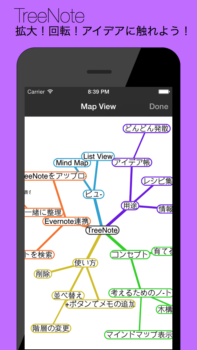 ツリー構造で情報を整理するメモツールです。木が枝分かれして育っていくように、考えが広がっていく、そんなコンセプトで開発しました。また、エバーノート連携であることも特徴の一つで、エバーノートのノートも一緒に構造化することができます。