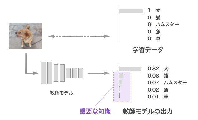 一方、学習済みの教師モデルの出力は、合計すると1になる確率の形で、クラスごとのスコアとして出力されます。正解出ないクラスのうち、猫は惜しいけど車は全然惜しくない、といったことも、相対的なスコアから知ることができます。概念的に何と近いのか、どれとは全然違うのかといった情報を知ることができるため、学習データよりもより豊かな情報を伝えることができます。この粒度の細かい情報こそが、生徒モデルの学習に利用したい「重要な知識」となります。
