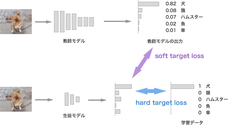 先ほど説明した通り、教師モデルの出力を学ぶべき「知識」として生徒モデルの学習に利用します。具体的には、教師の出力をソフトターゲットとして、生徒の出力の分布がこれと近くなるような損失(soft target loss)を学習に利用します。また、学習データが利用可能な場合は、通常通り学習データの正解ラベルをハードターゲットとしてクロスエントロピーなどの損失(hard target loss)を利用します。ラベルなしのデータを利用し、soft target lossのみで知識の蒸留を行うことも可能です。