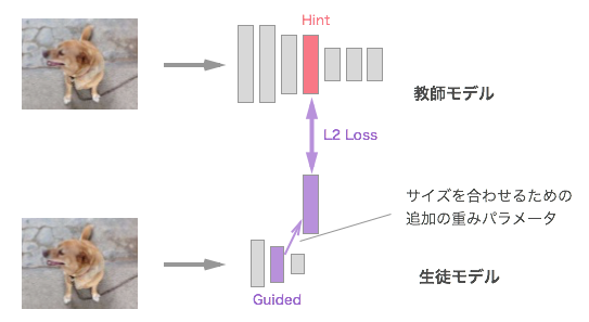 教師の出力だけでなく、中間層の情報を利用する方法です。教師モデルの中間層をヒントとして生徒モデルの学習に利用する方法は [4] で提案されており、 [8] でも使われています。通常、教師の方が大きいモデルで隠れ層のユニット数が多いため、サイズを合わせるための追加の重みを間に噛ませる形になっています。なお、中間層の情報のみで知識の蒸留を行うというよりも、出力層での知識の蒸留に追加する形で利用されています。