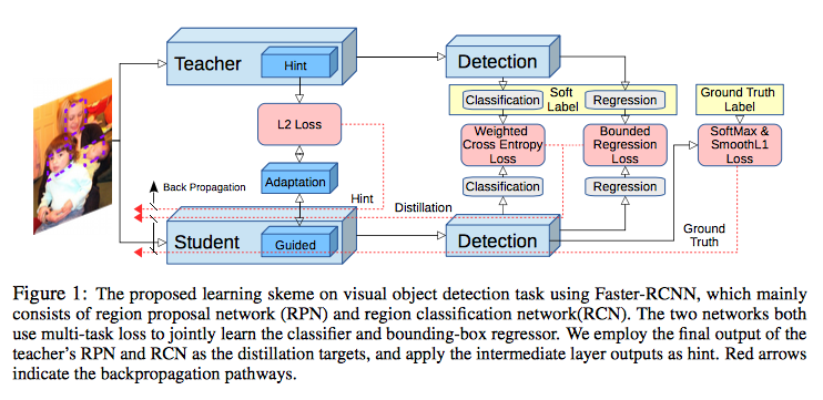 この論文では、物体検出タスクへ知識の蒸留を適用しています。Faster RCNNをベースに、教師の予測結果(ボックス位置、クラス)をソフトターゲットとして知識の蒸留をしているほか、中間層の情報をヒント [4] として利用しています。知識の蒸留の枠組みを使い、精度-速度のトレードオフを改善。