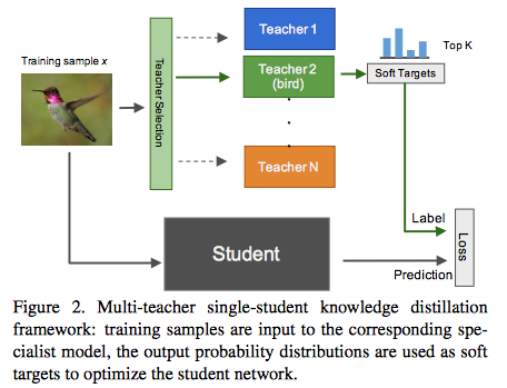 知識の蒸留の枠組みを利用して、約100,000クラスという超多クラスの分類モデルを訓練する取り組みです。車や鳥といった大分類ごとに教師であるスペシャリストモデルを訓練しておき、複数のスペシャリストからの知識の蒸留という形で、100Kクラスの分類モデルを訓練しています。