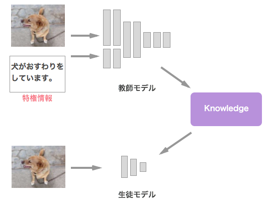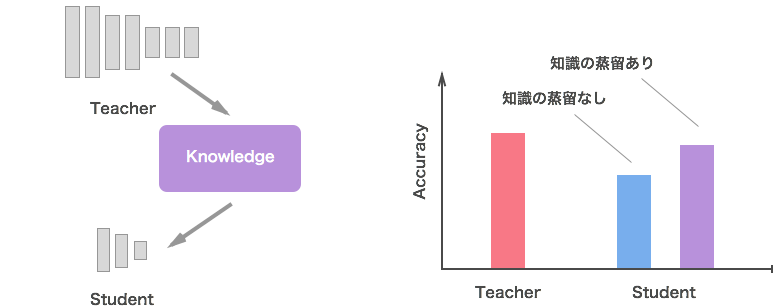 通常の学習では学習と推論に同じモデルを利用しますが、知識の蒸留の枠組みでは、学習データから知識を構造化・一般化する部分は教師モデルが担当し、その知識を蒸留して推論に適した生徒モデルに継承させる、というように役割分担をする形となっています。
