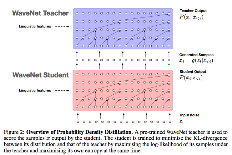 リアルな音声の合成が可能なWaveNetですが、音声データをシーケンシャルに生成する(過去の自身の生成結果を利用する)ため非常に時間がかかるという問題がありました。そこで、学習済みのWaveNetを教師として、(過去の生成結果ではなく)ノイズから音声データを生成できる生徒モデルを訓練することで、並列実行可能な音声合成モデルを構築したとのことです。